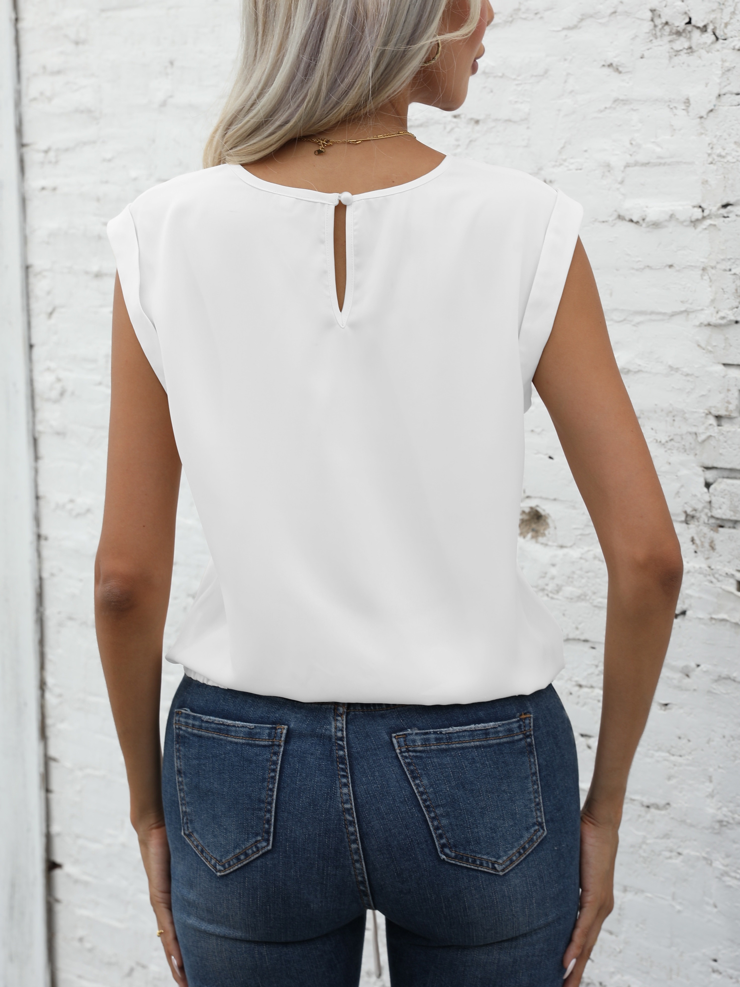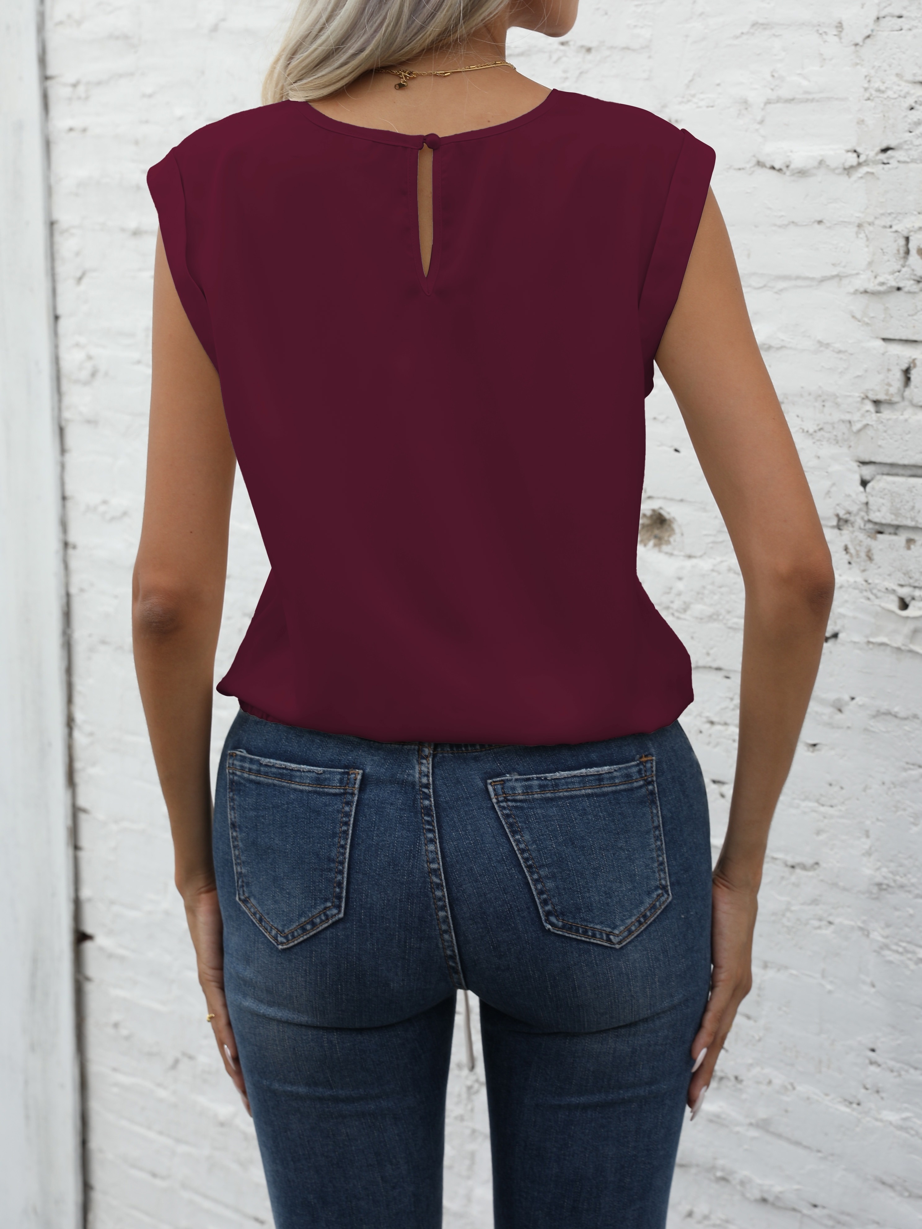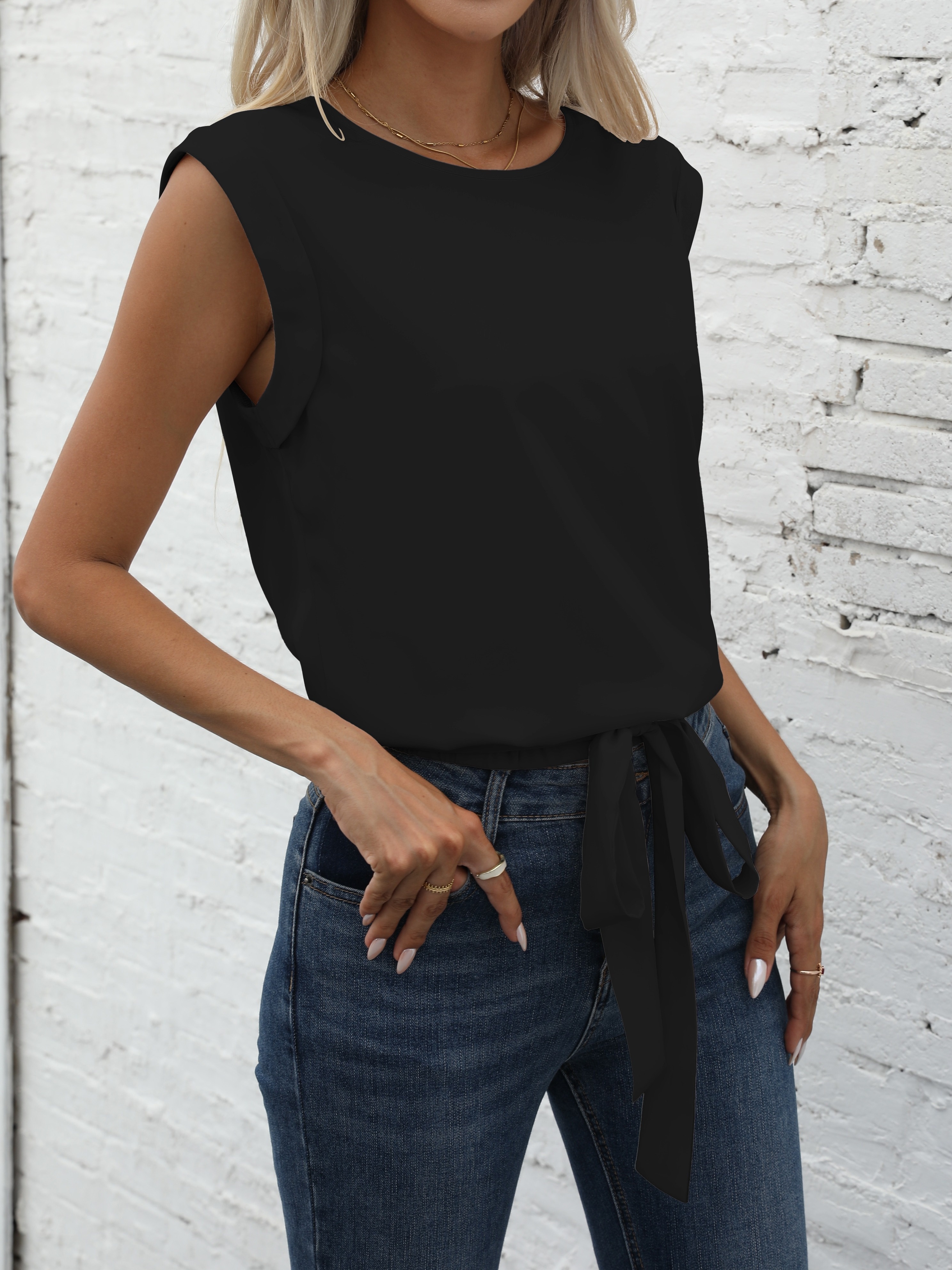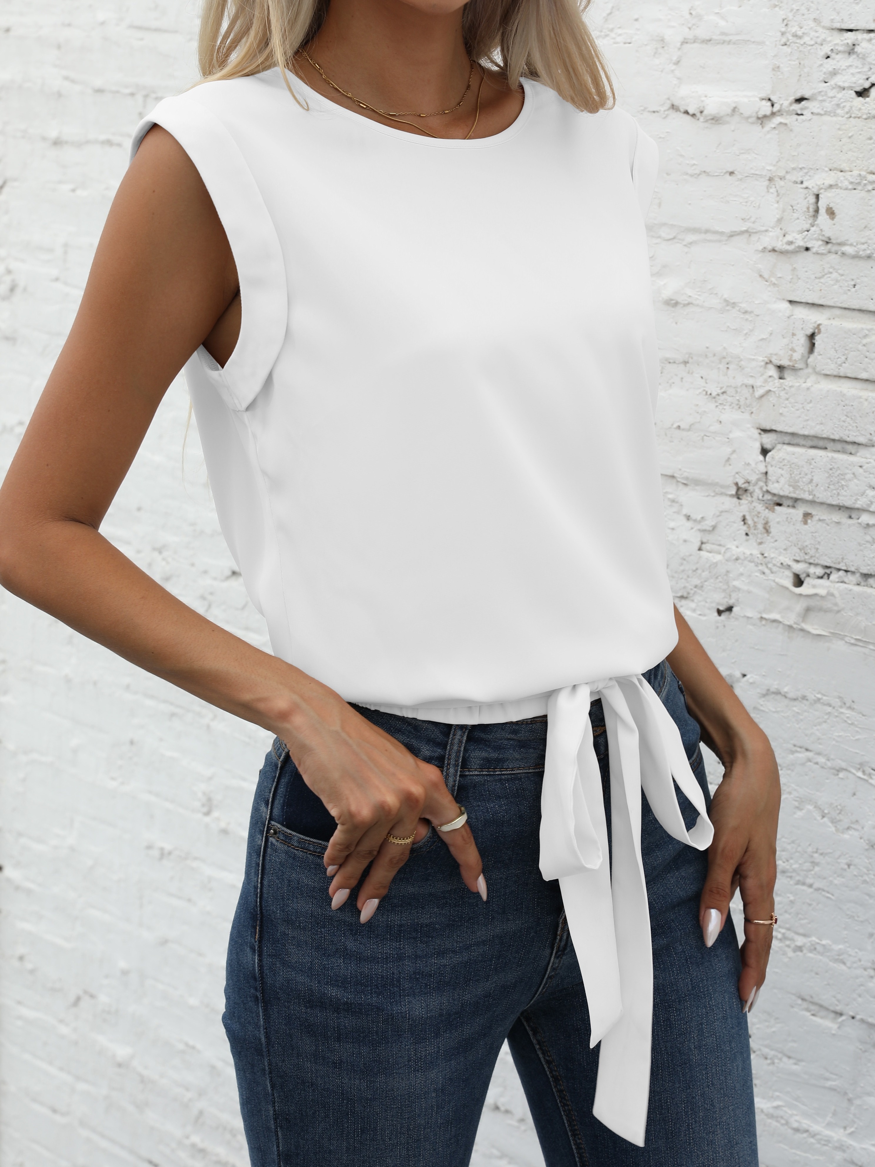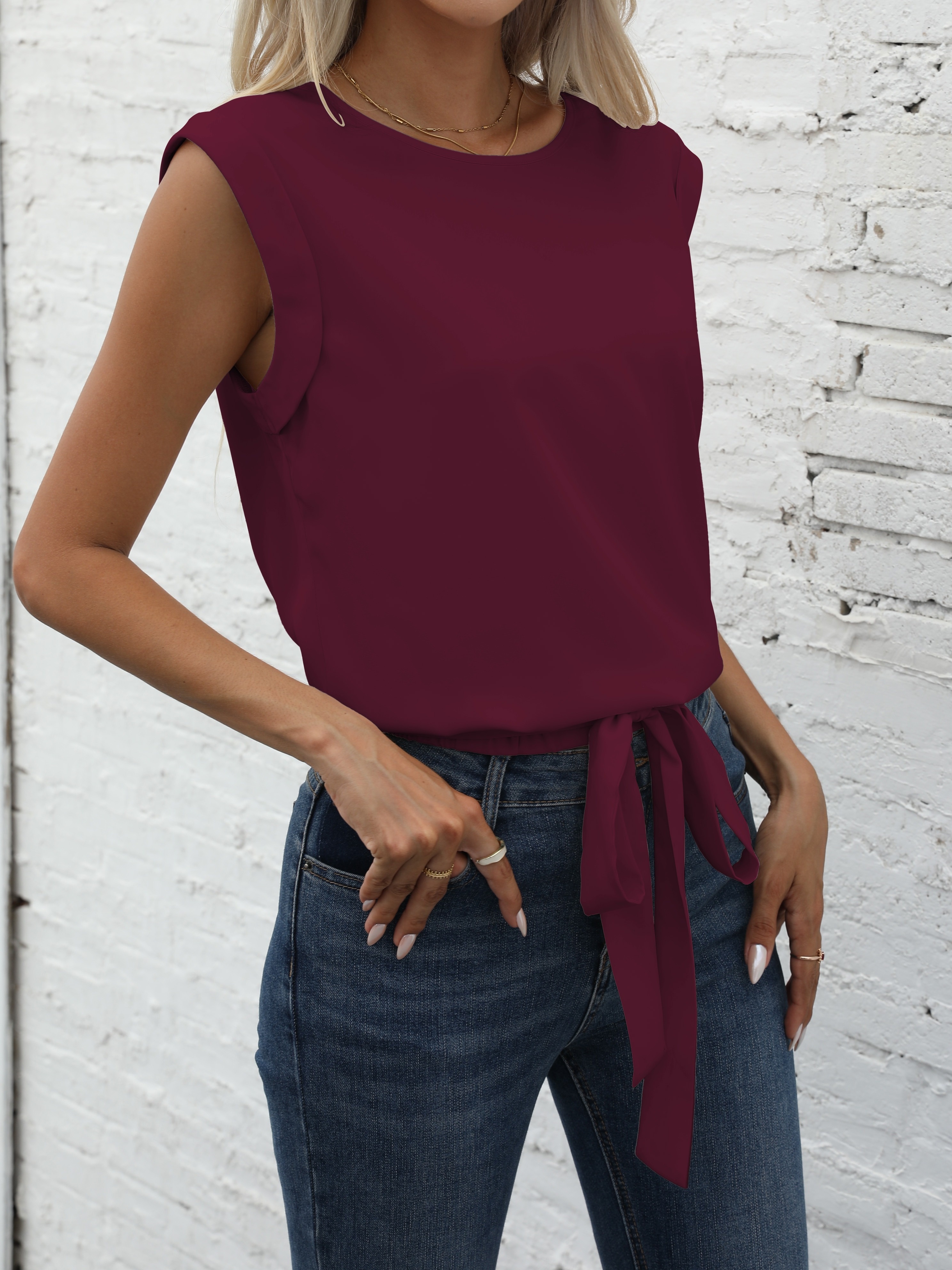 Chic Keyhole Back Tie Front Blouse - Effortless Casual Style with Classic Crew Neck Design - Perfect for Womens Spring and Summer Fashion
