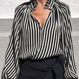 Chic Striped V-Neck Blouse with lettuce trim - Fashionable Long Sleeve Top for Women - Elegant Casual Wear