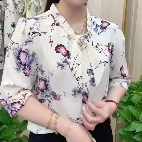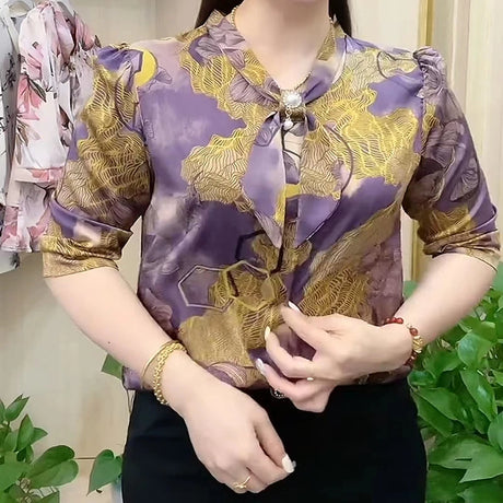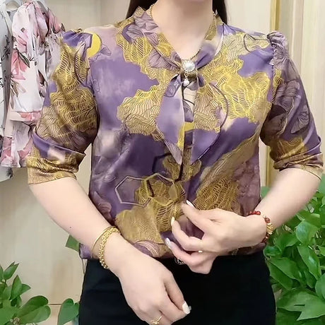 Plus Size Casual Blouse, Women's Plus Figure Print Cap Sleeve Turn Down Collar Blouse