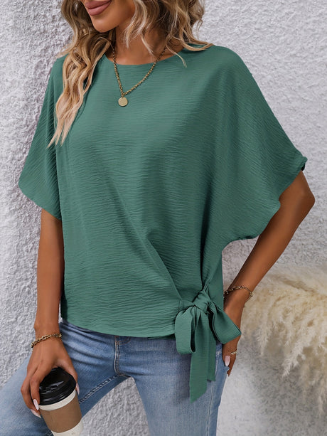 Solid Knotted Blouse, Casual Crew Neck Asymmetrical Blouse, Women's Clothing