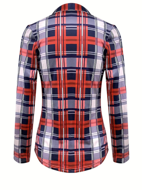 Casual Long Sleeve V Neck Plaid Print Drawstring Blouse - Women's Clothing