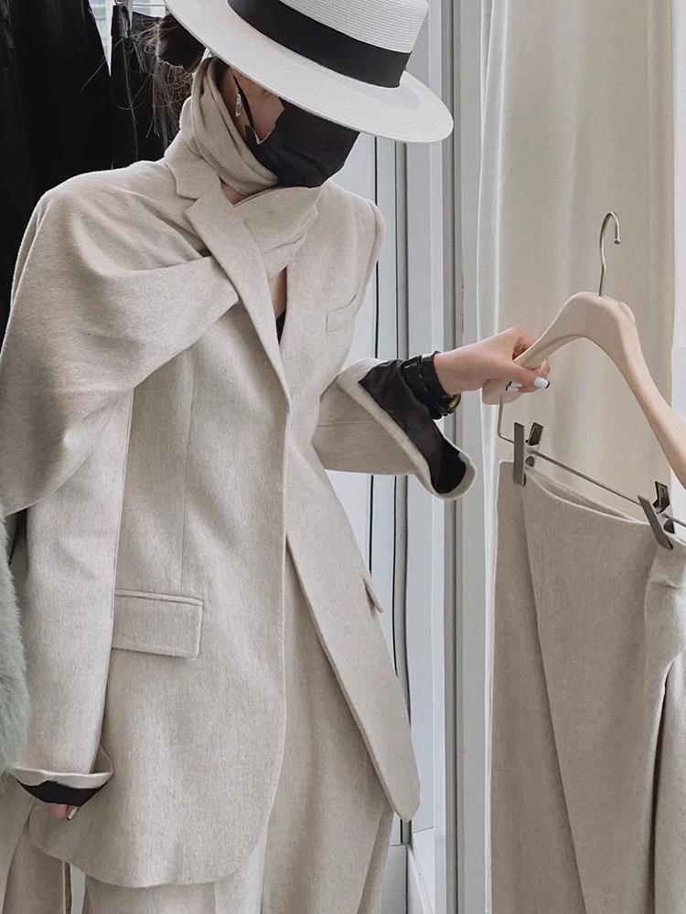 TWOTWINSTYLE Solid Minimalist Blazer For Women Scarf Collar Long Sleeve Patchwork Pocket Asymmetrical Blazers Female Fashion New - Apricot / XL is backordered and will ship as soon as it is back in stock.