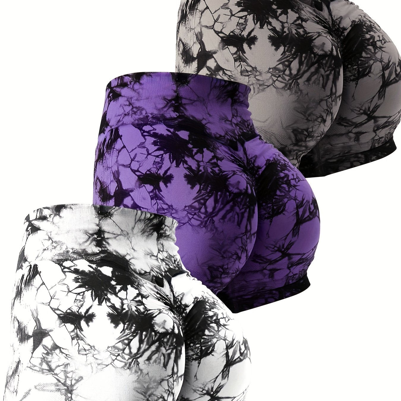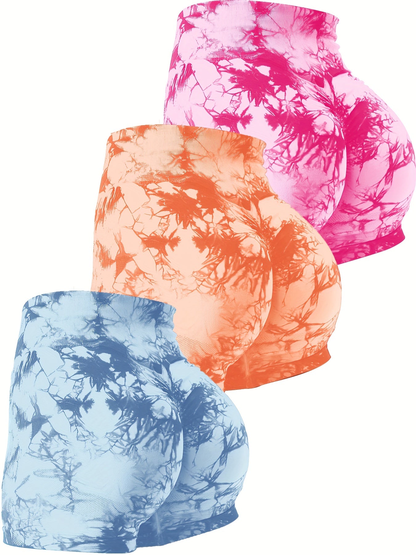 3 Piece Tie Dye Workout Shorts For Women, Scrunch Butt Lifting High Waisted Yoga Gym Seamless Booty Biker Shorts, Women's Activewear