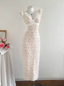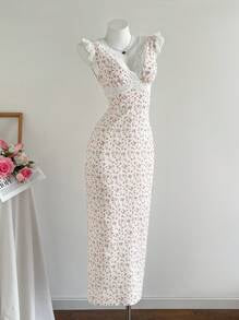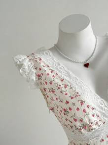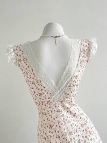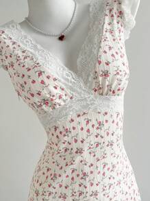 Elamini Women's V-Neck Lace Patchwork Ditsy Floral Dress
