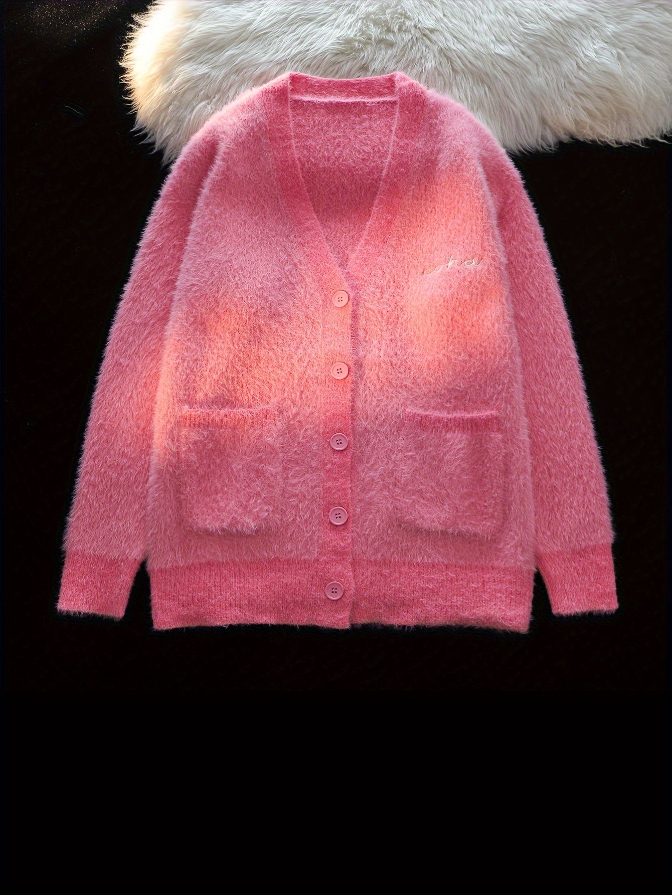 1pc Korean Style Casual V-Neck Pink Mink Soft Cardigan Sweater for Men - Loose Fit Polyester Knit with Embroidery Detail and Button Closure, Adult Fashion Essential for Autumn/Winter