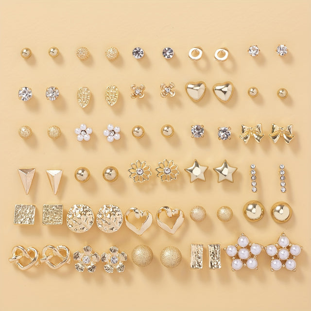 30 Pairs Bowknot Faux Pearl Heart Flower Water Drop Star Metal Simple Earrings Set