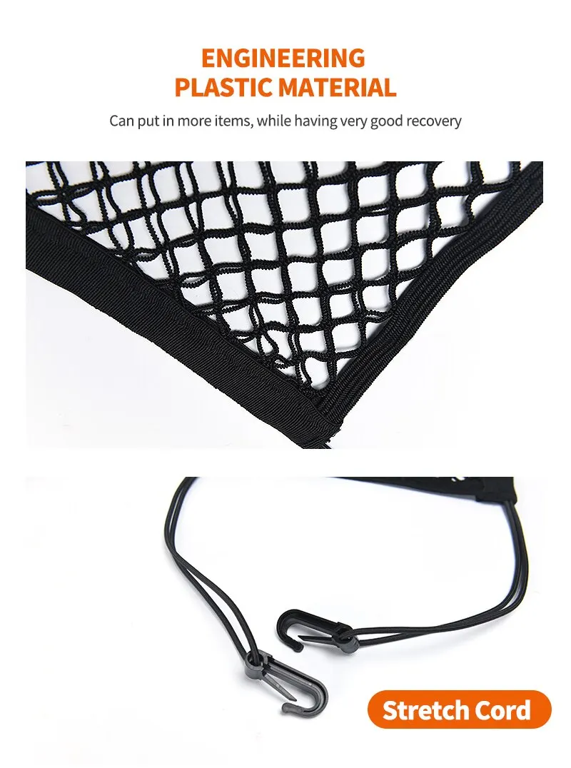 • Elastic Mesh Net :The elastic mesh net provides a flexible and durable solution for storing items in your car.