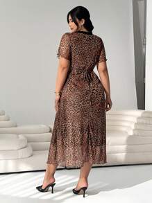 easyown Plus Size Leopard Print Mesh & Contrast Lace V-Neck Dress Flowy Dress Milkmaid Dress