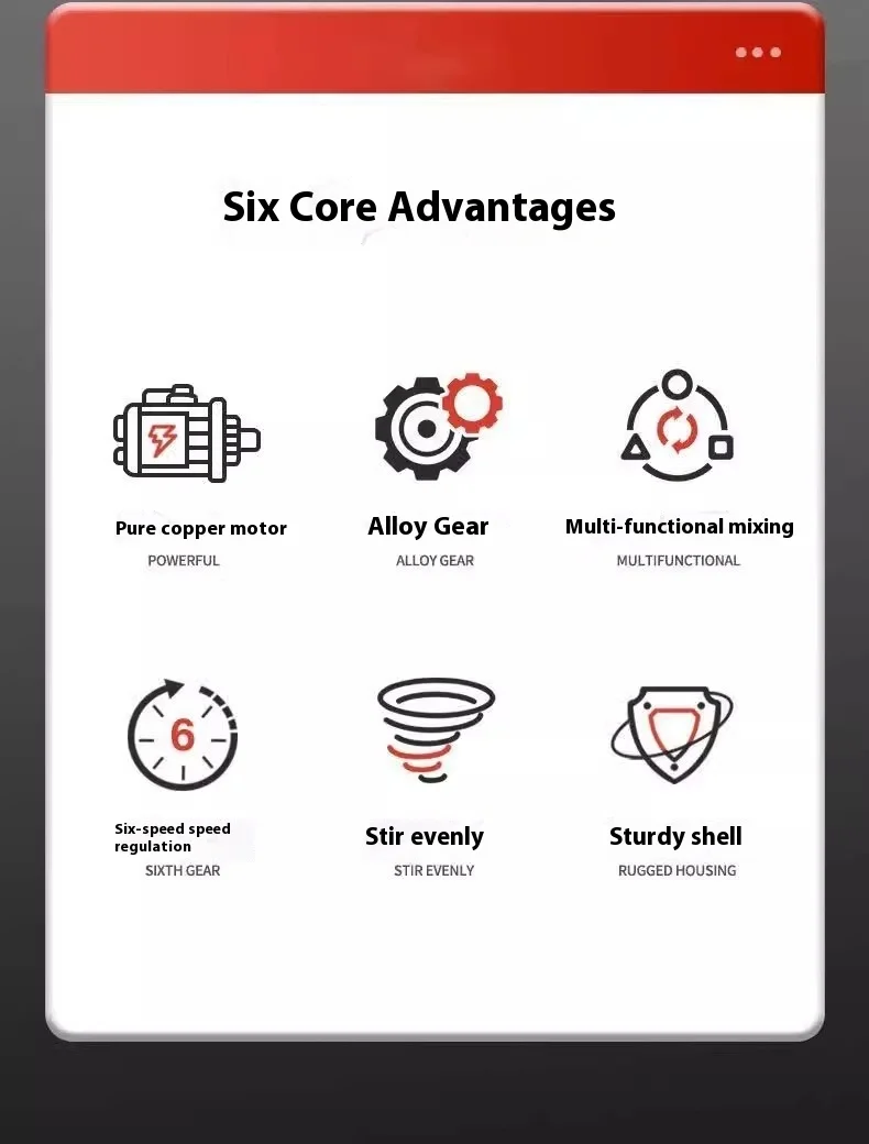 This 2100W electric mixer features 6 gears of adjustable speed, with rapid cooling design and ergonomically designed handle shank. Easy to control and convenient to use, it is a great choice to make your working efficient.