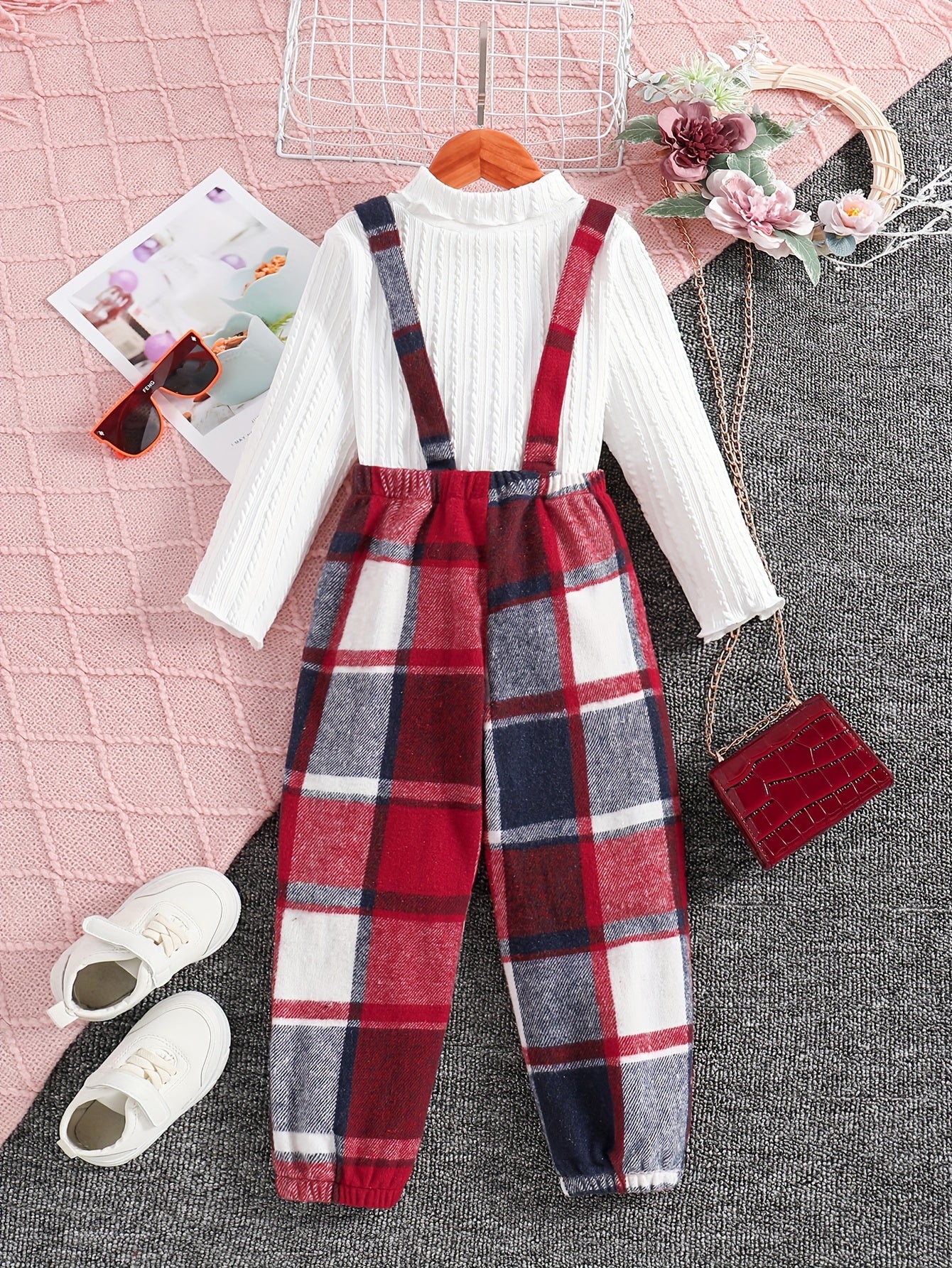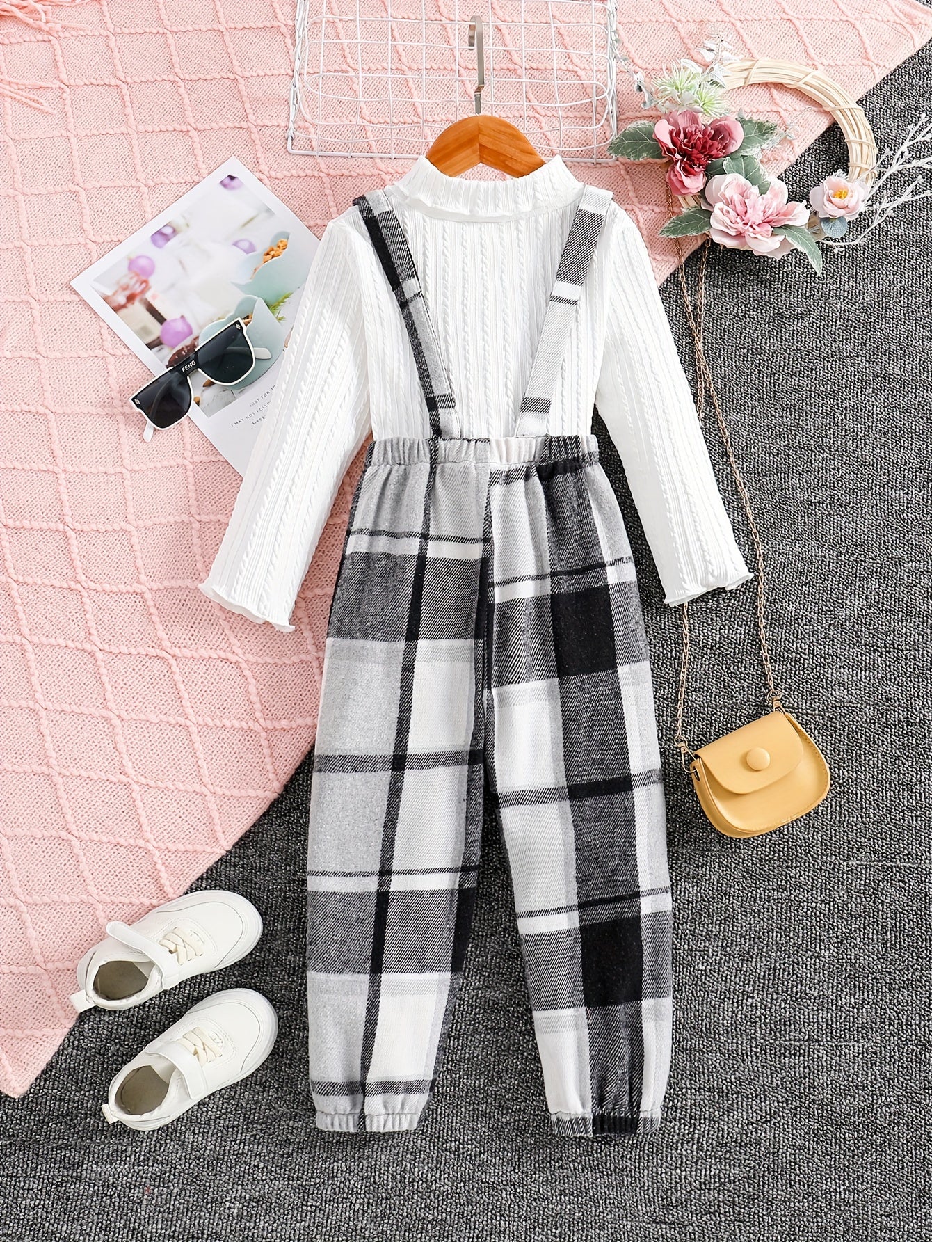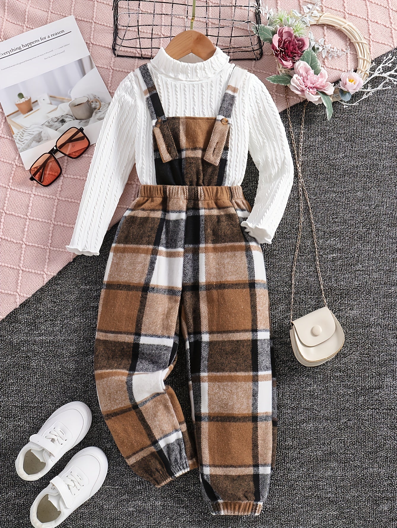 Girls 2pc, Solid Pullover Long Sleeve Top + Plaid Jumpsuit Kids Clothes For Spring Fall Outdoor