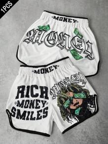 Manfinity Streetrush Men's Street-Style Sports Shorts For INS-Inspired Outfits, Featuring A High-Street "Money And Prosperity" Creative Dreadlock Hip-Hop Rock Portrait With Oversized Dual-Sided Letter Prints In White, Perfect For Music Festivals, Hawaiian