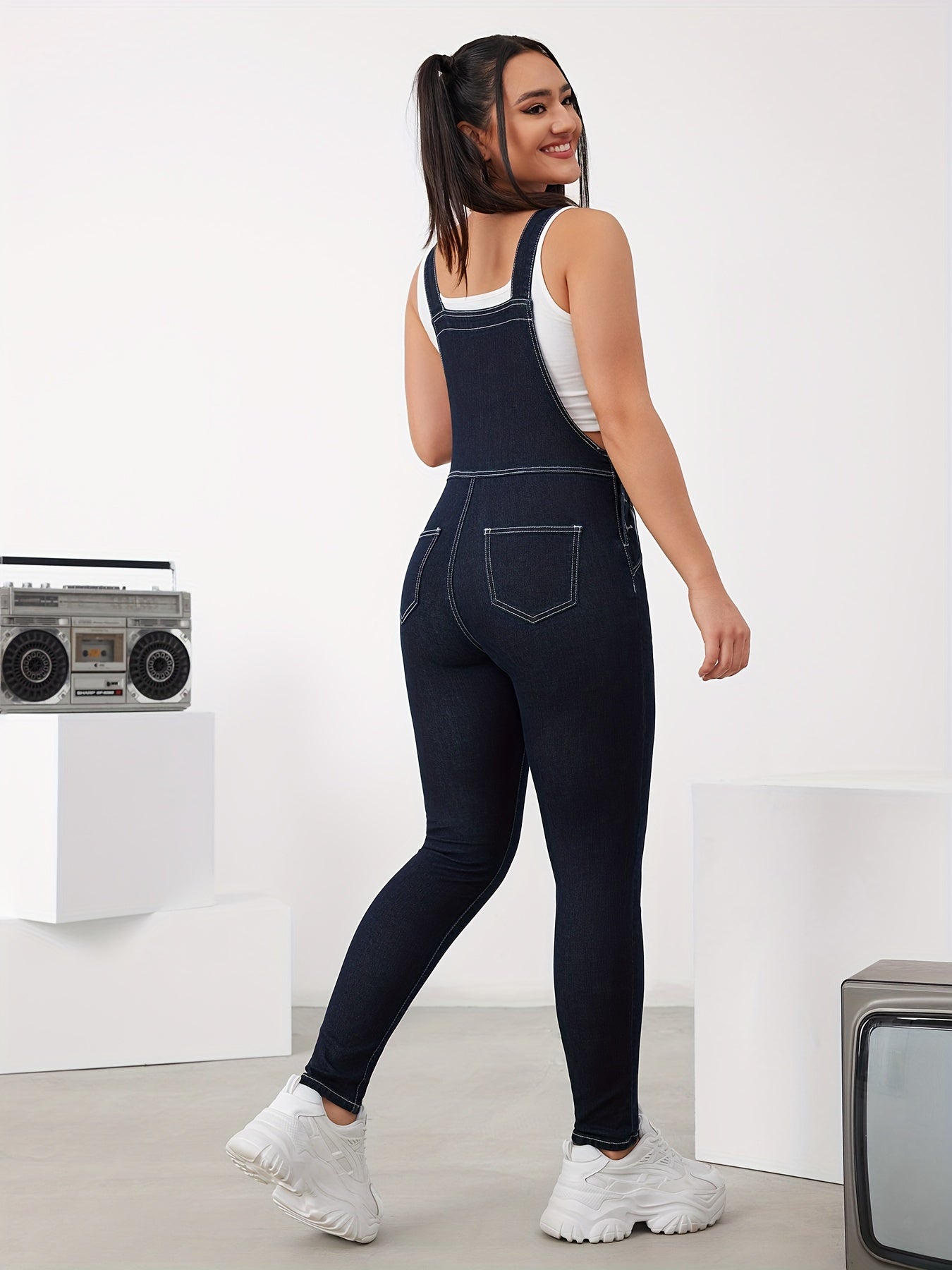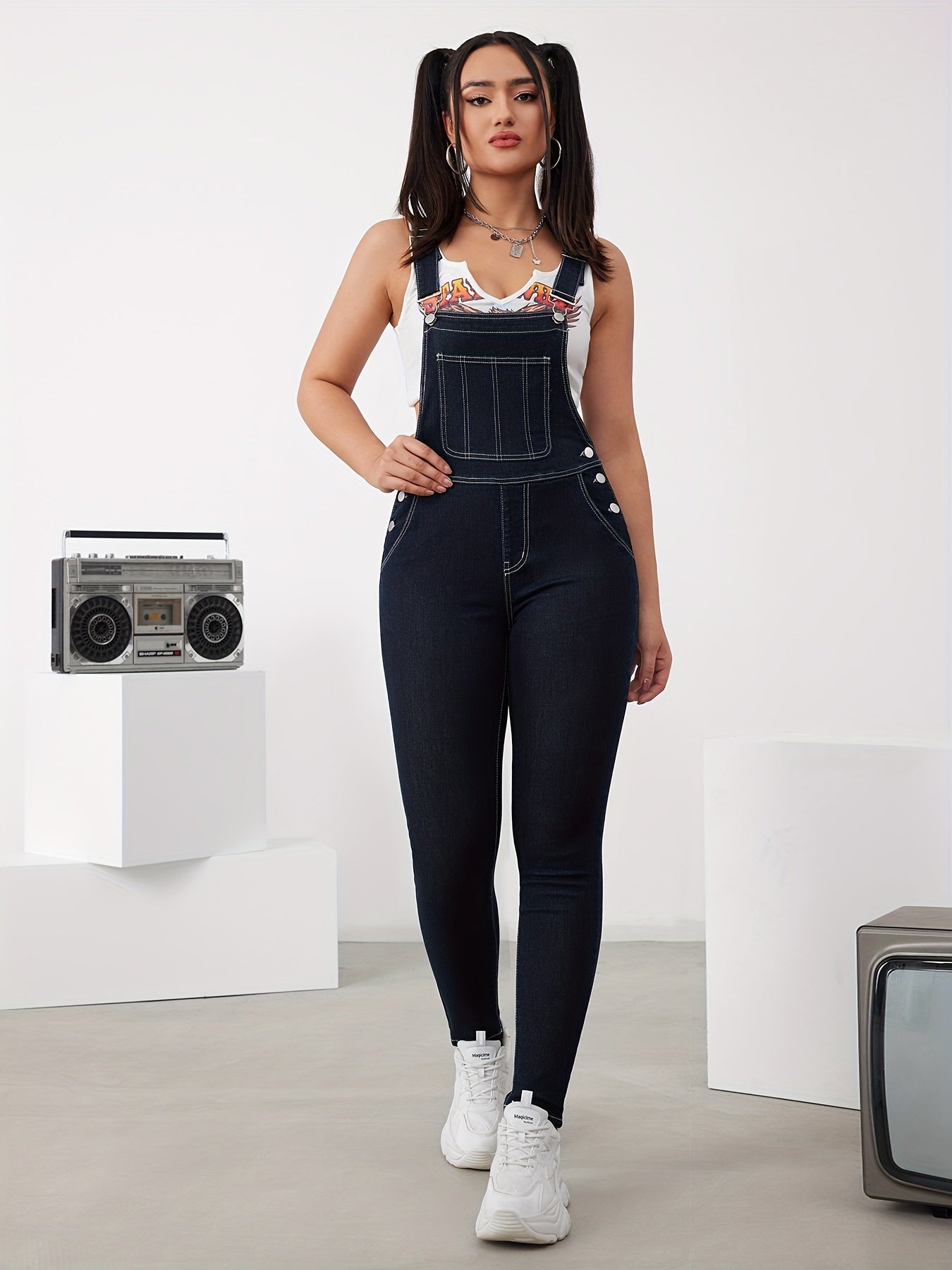 Side Button High Elastic Denim Overalls, Adjustable Strap Elegant Fitting Denim Jumpsuits, Women's Denim Jeans & Clothing