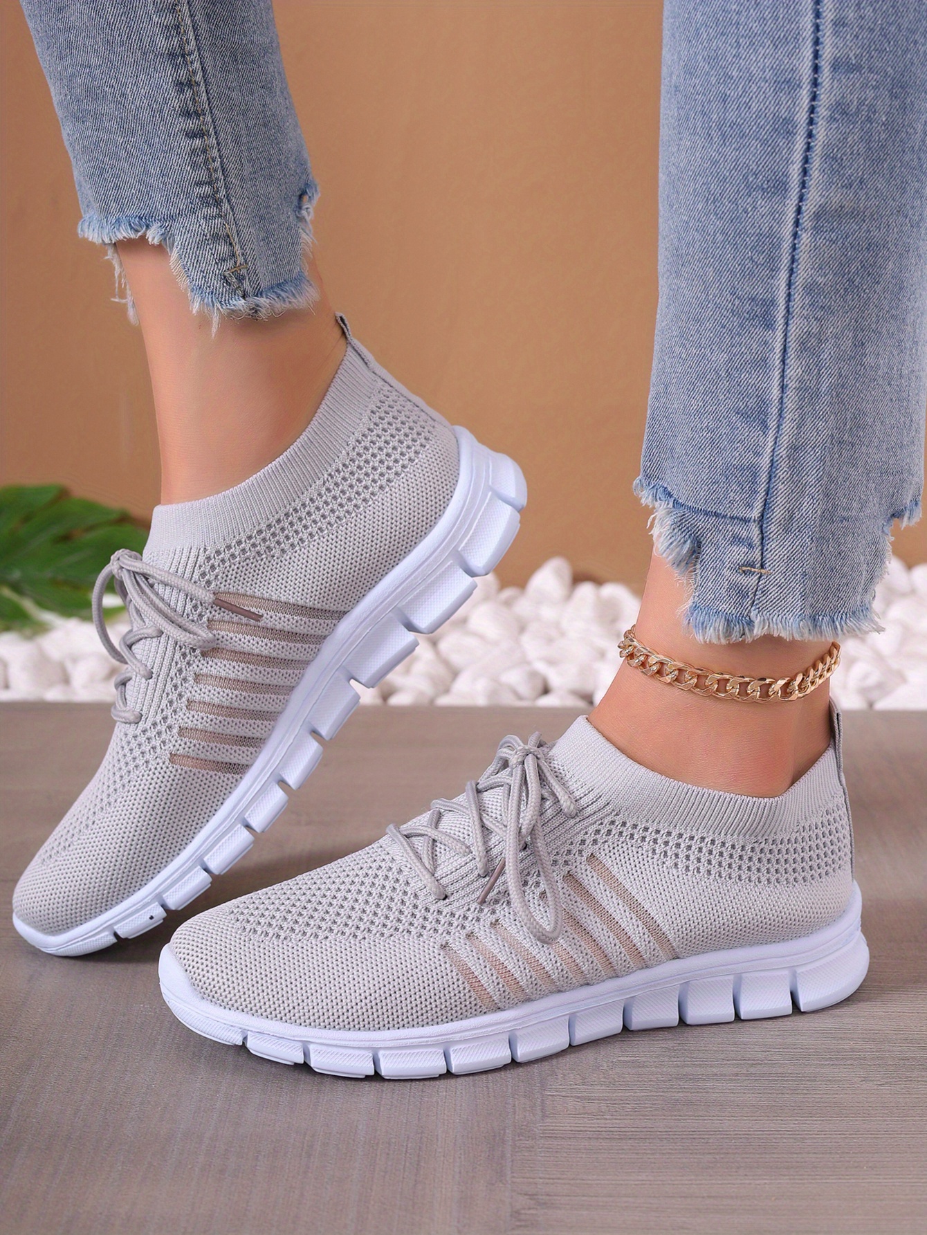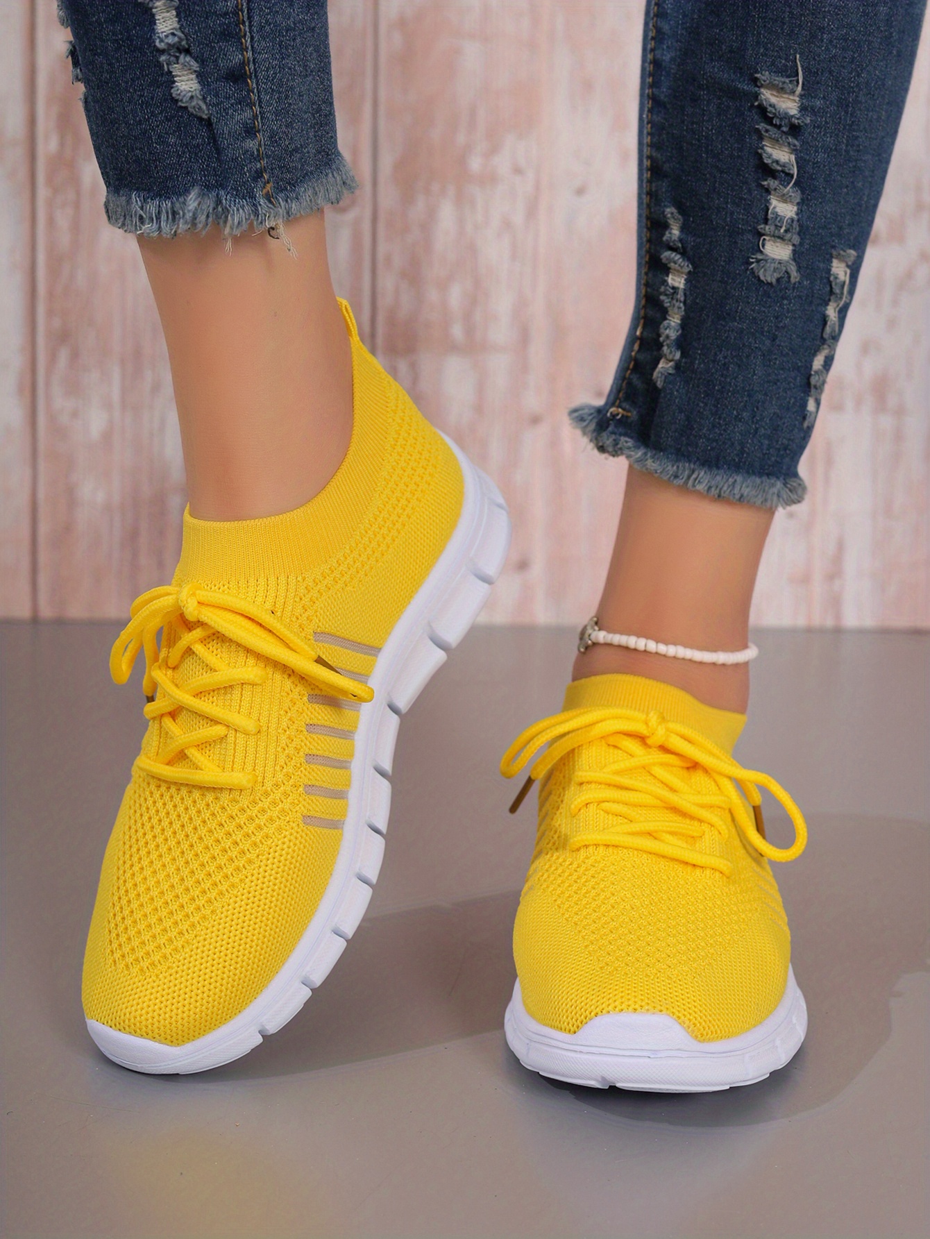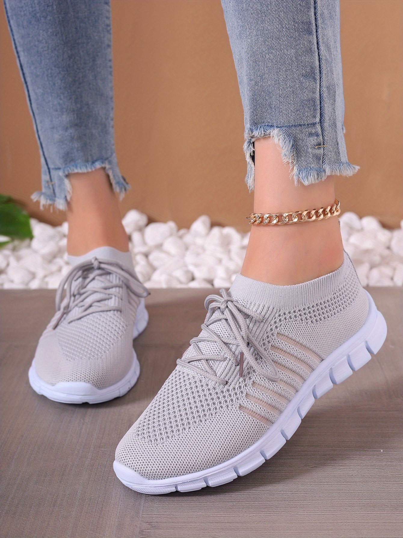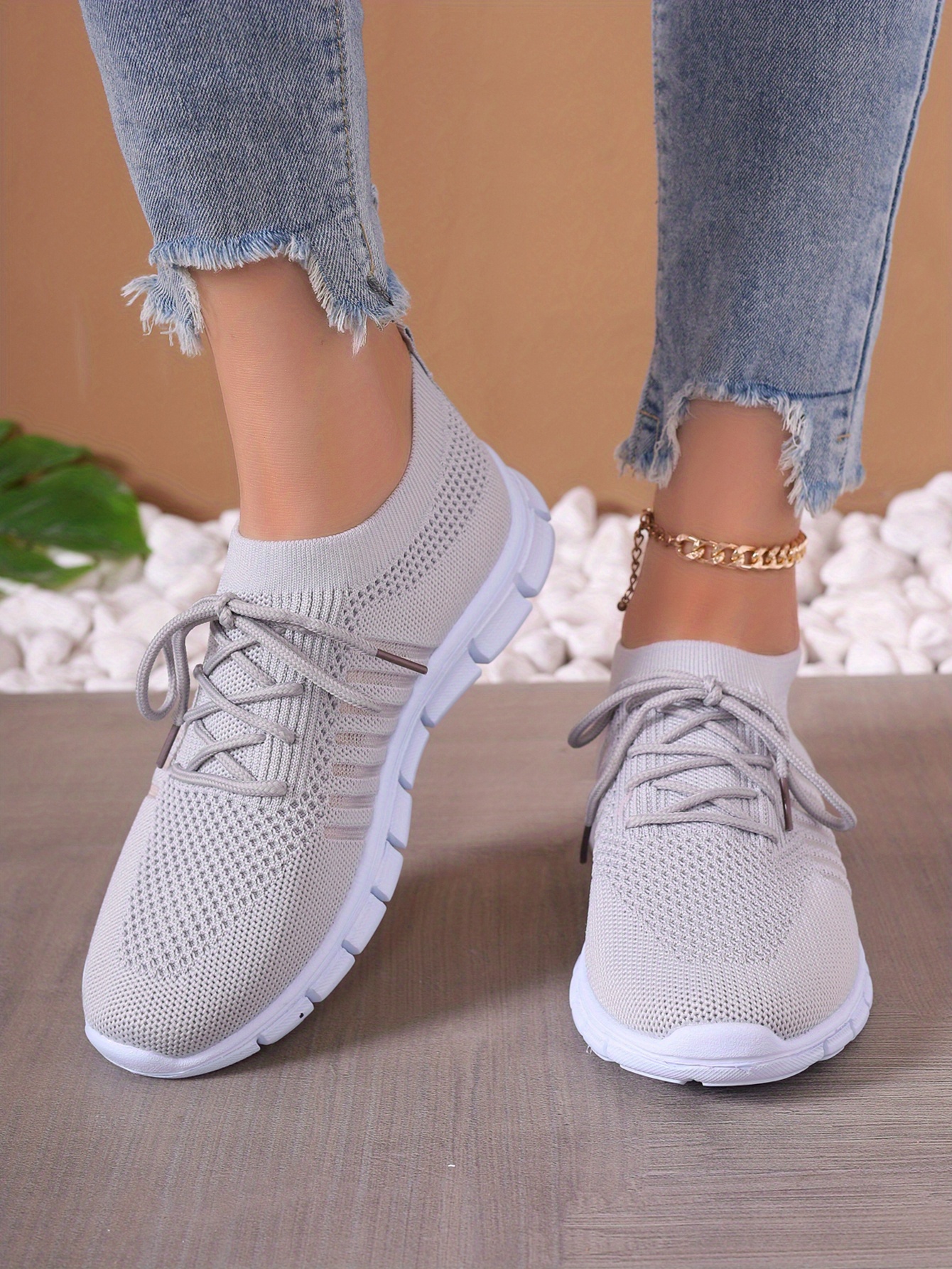 Womens All-Season Lace Up Knit Sneakers - Breathable Mesh Upper, Comfortable Fabric Insole, EVA Sole, Versatile Solid Color Running Shoes for Casual Wear
