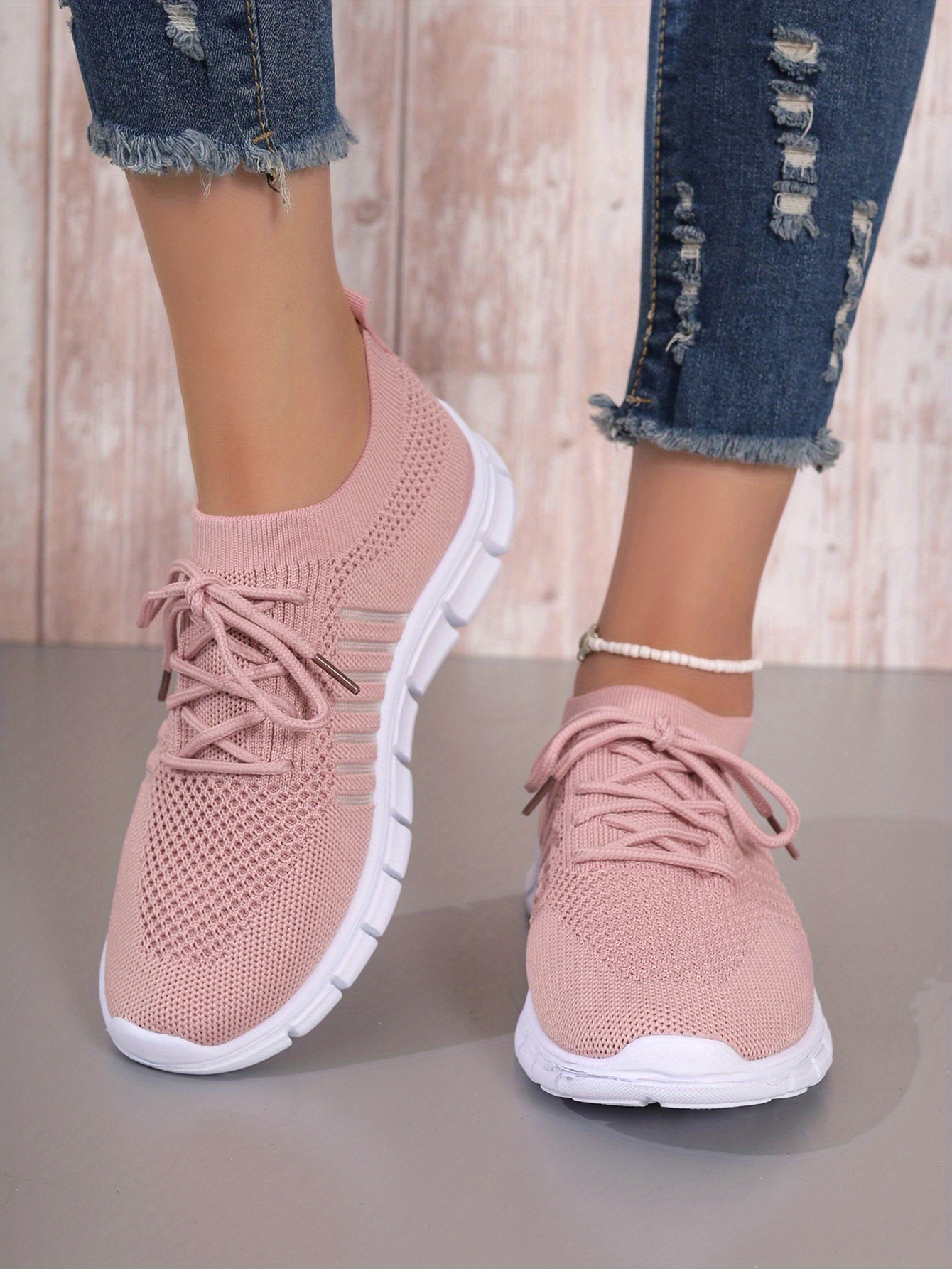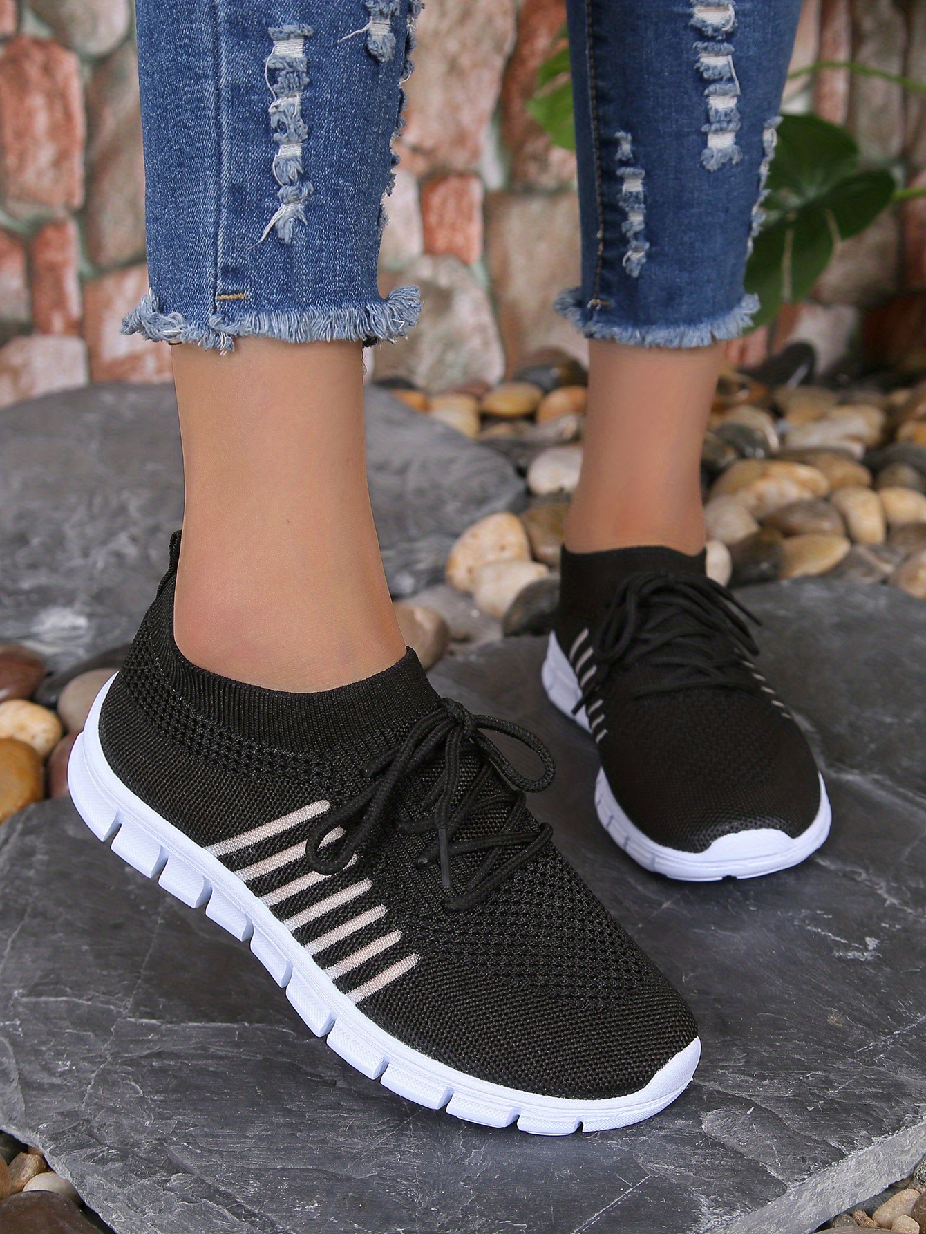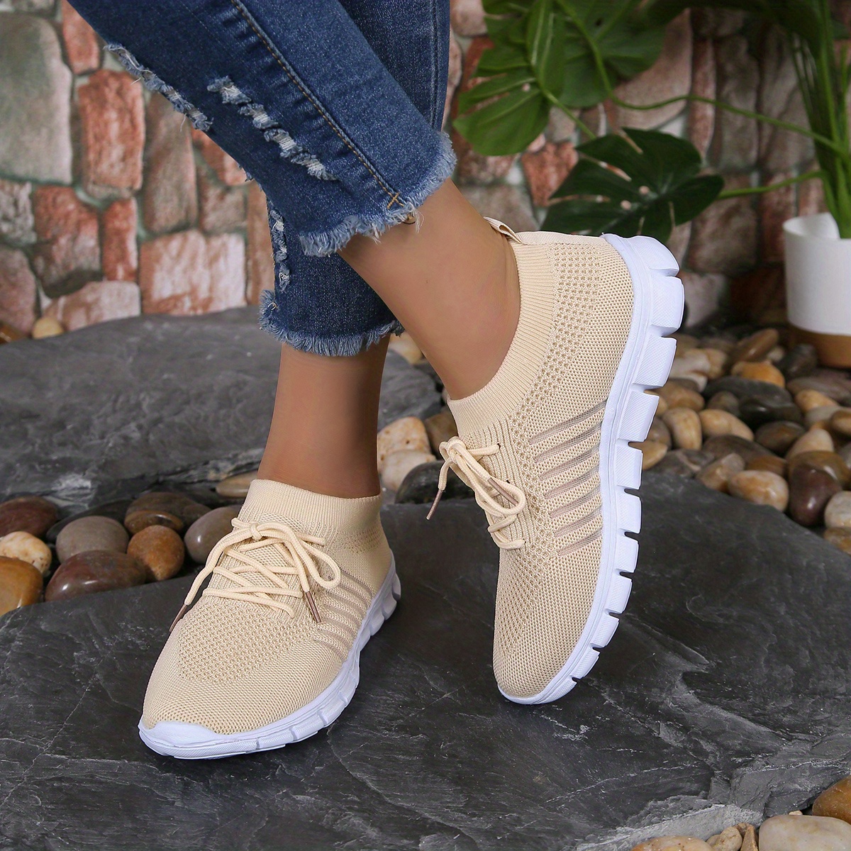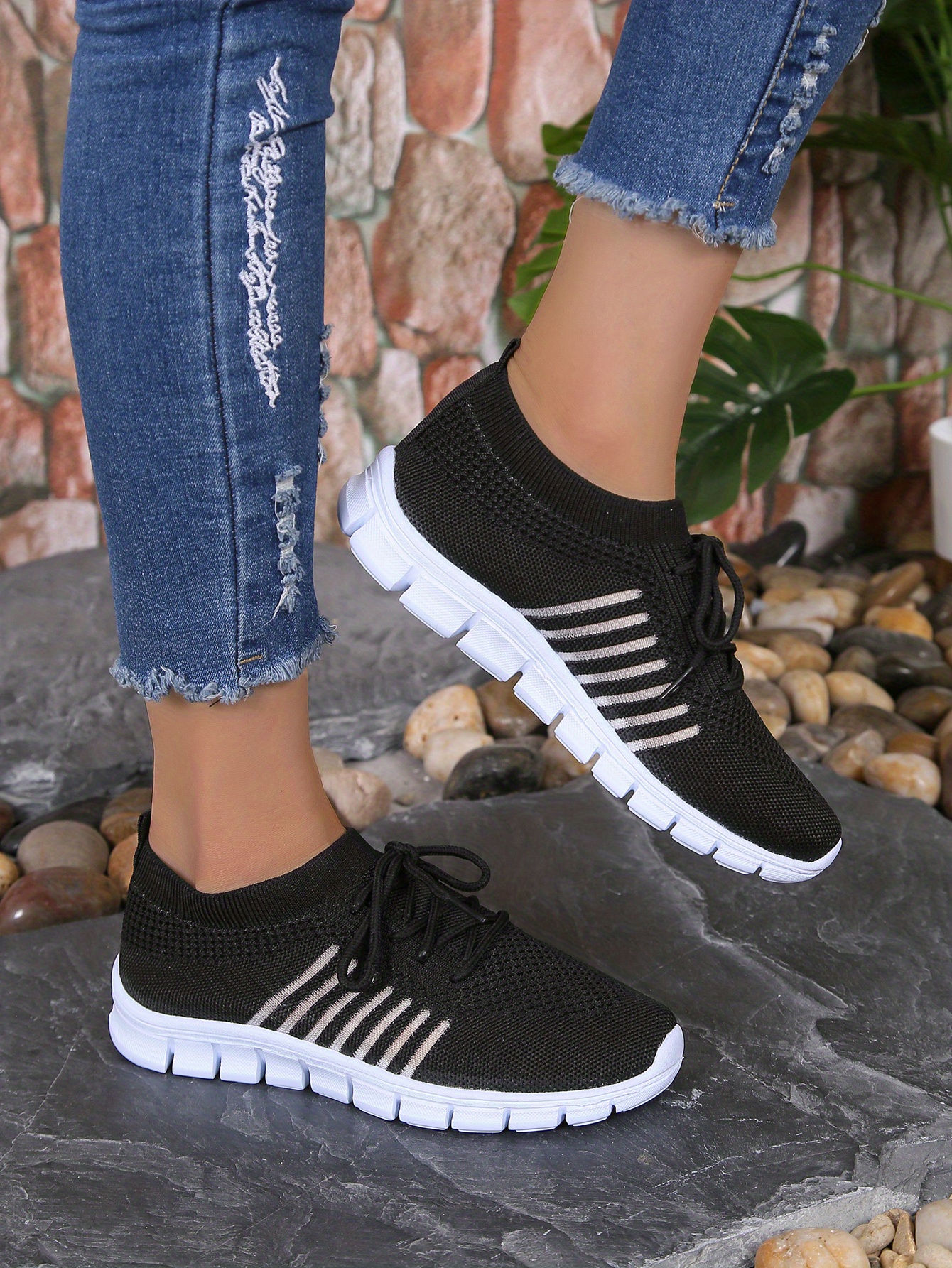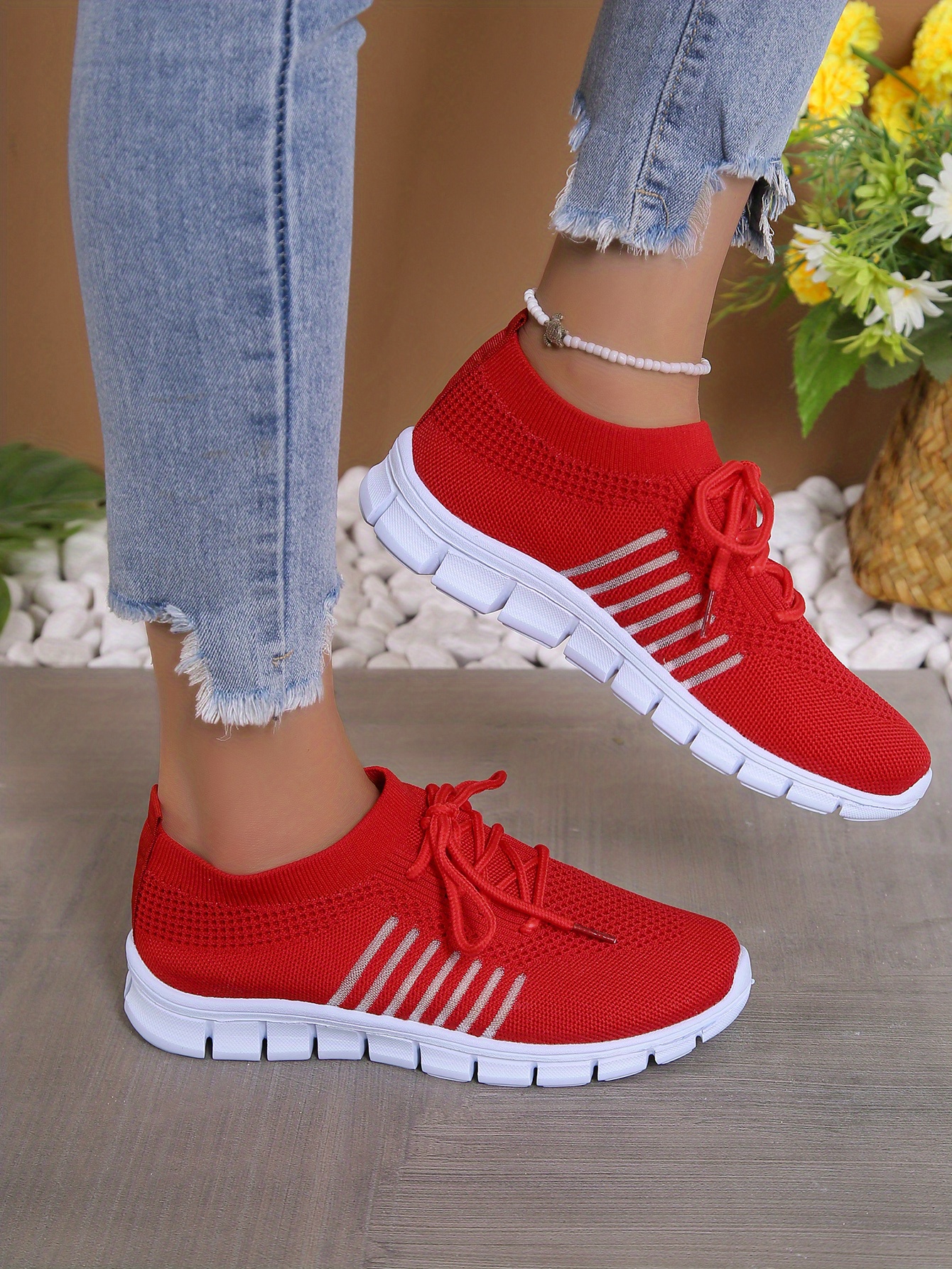 Womens All-Season Lace Up Knit Sneakers - Breathable Mesh Upper, Comfortable Fabric Insole, EVA Sole, Versatile Solid Color Running Shoes for Casual Wear