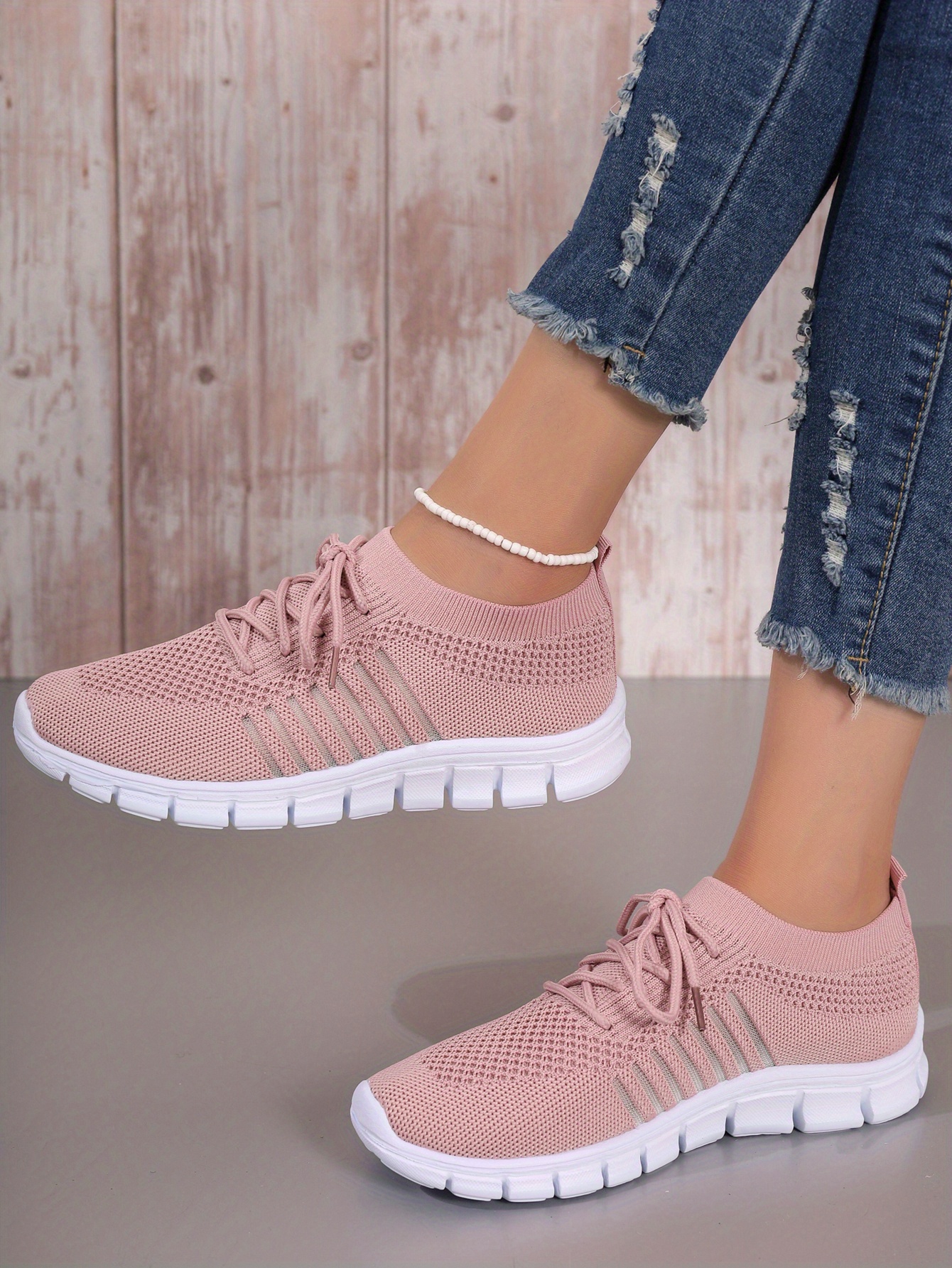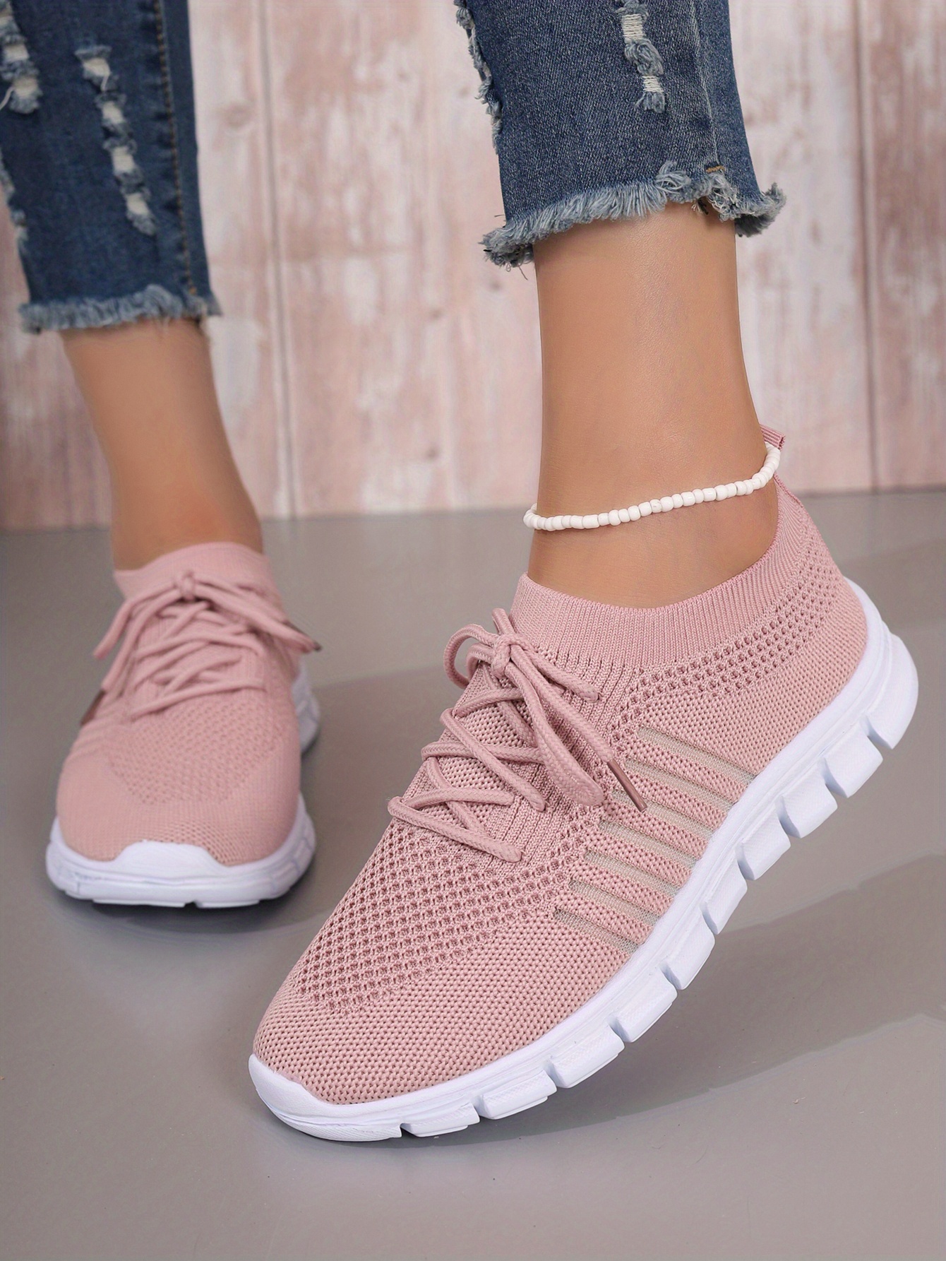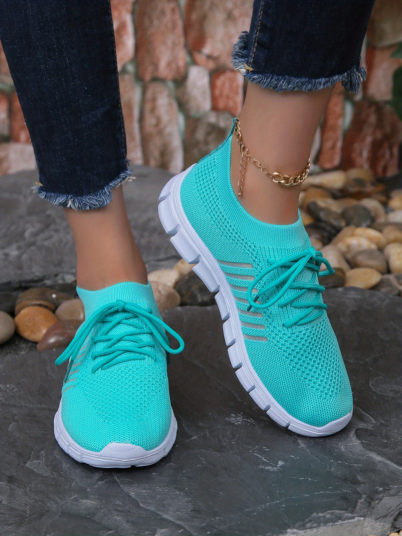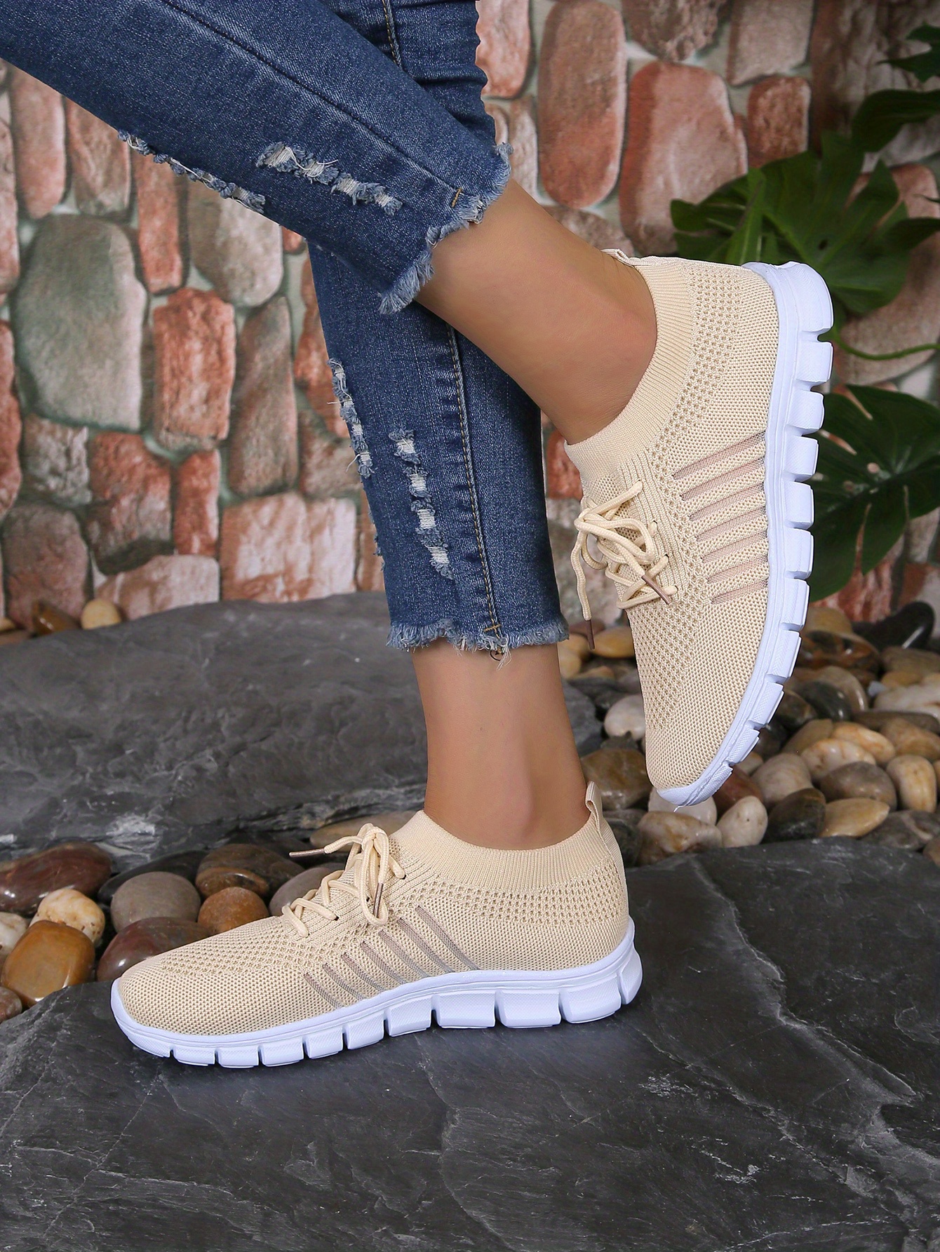 Womens All-Season Lace Up Knit Sneakers - Breathable Mesh Upper, Comfortable Fabric Insole, EVA Sole, Versatile Solid Color Running Shoes for Casual Wear