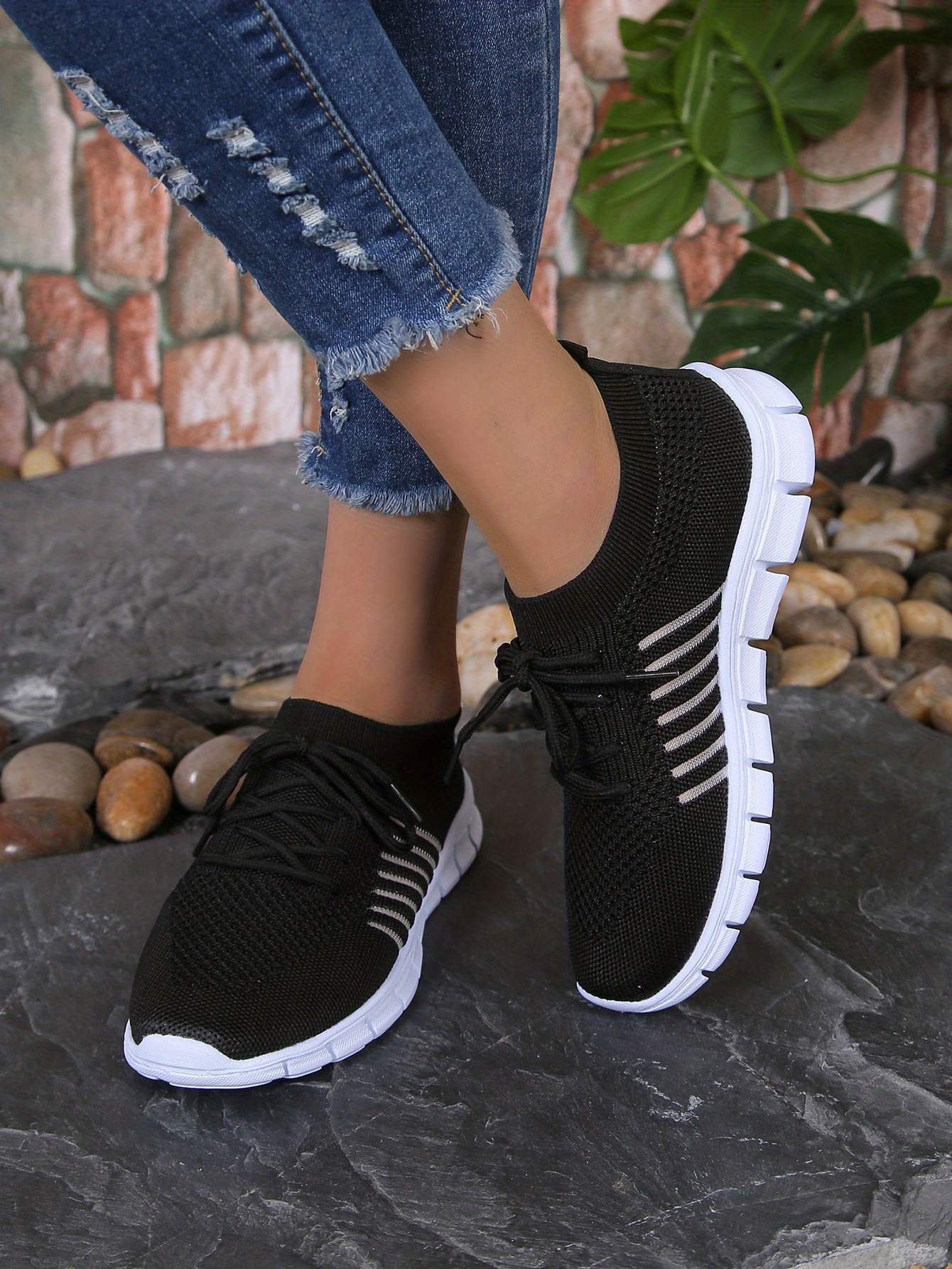Womens All-Season Lace Up Knit Sneakers - Breathable Mesh Upper, Comfortable Fabric Insole, EVA Sole, Versatile Solid Color Running Shoes for Casual Wear - Black / US 6.5 is backordered and will ship as soon as it is back in stock.